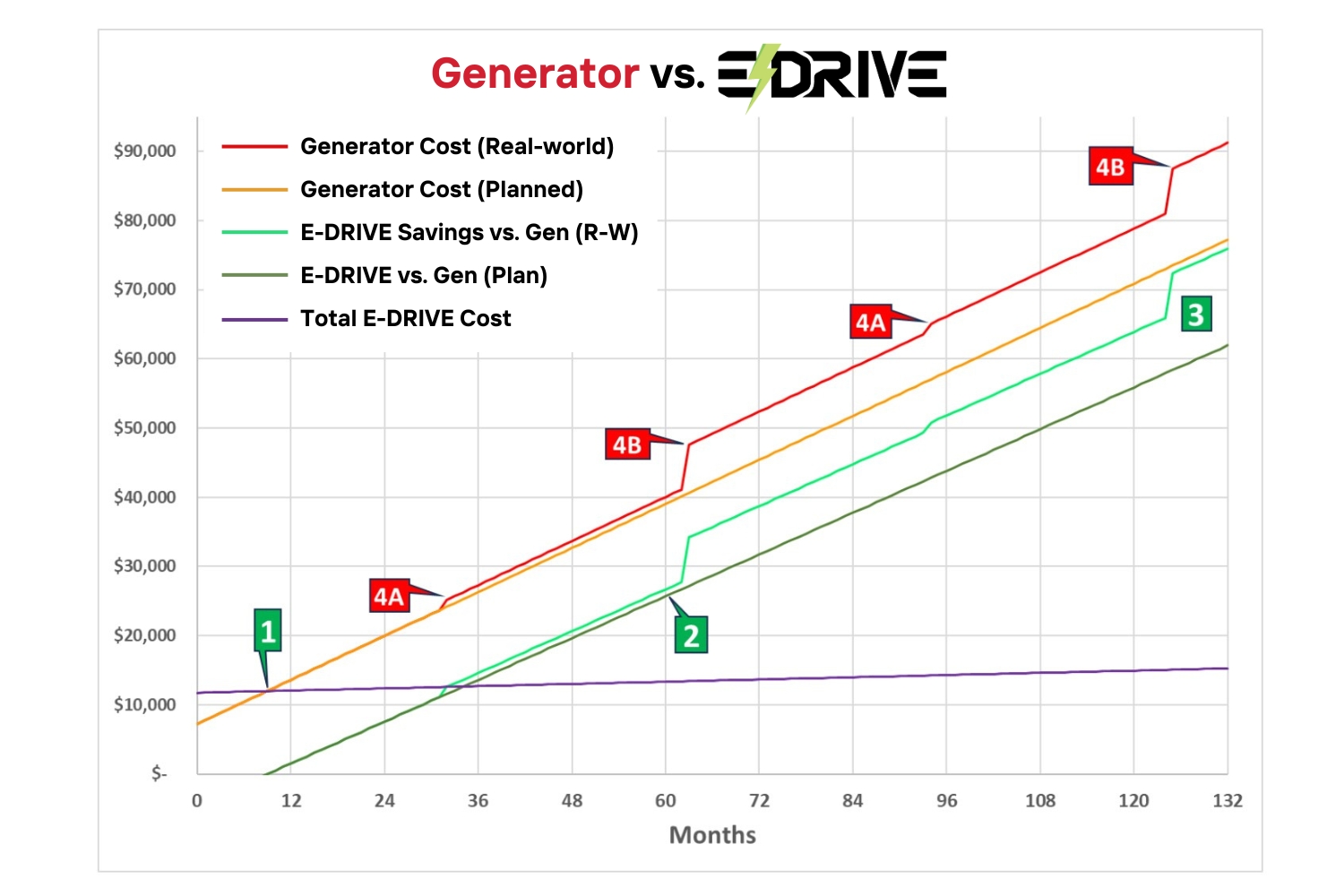 - Example calculation below for 160 hours/month, base E-DRIVE system cost vs. Onan QG 4000 onboard generator:
